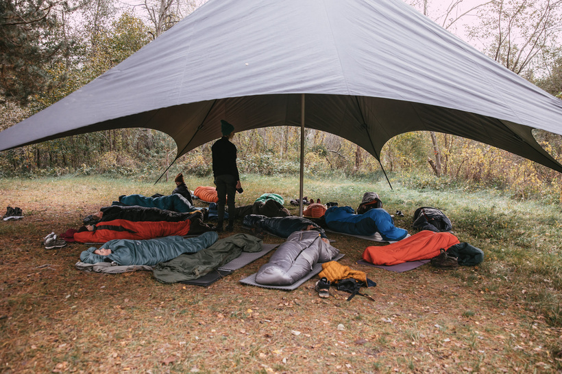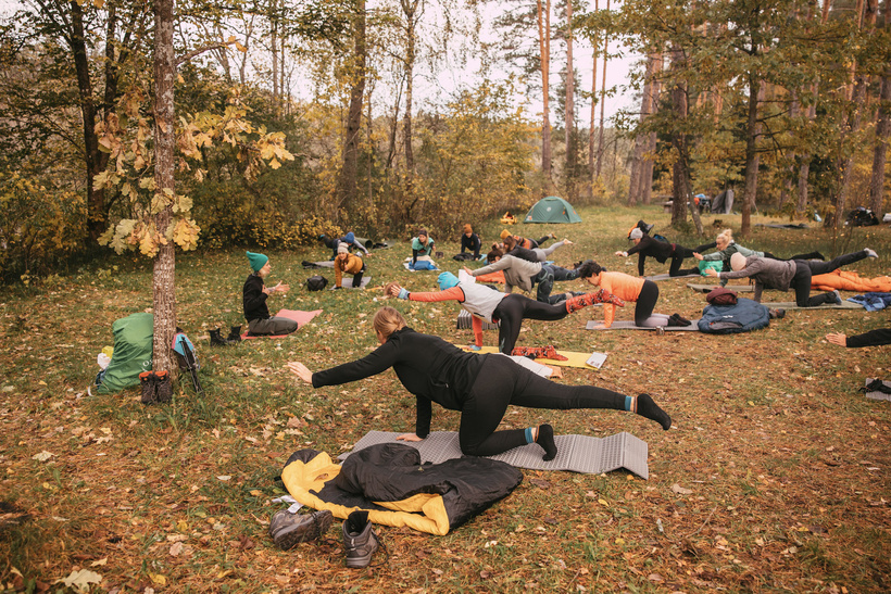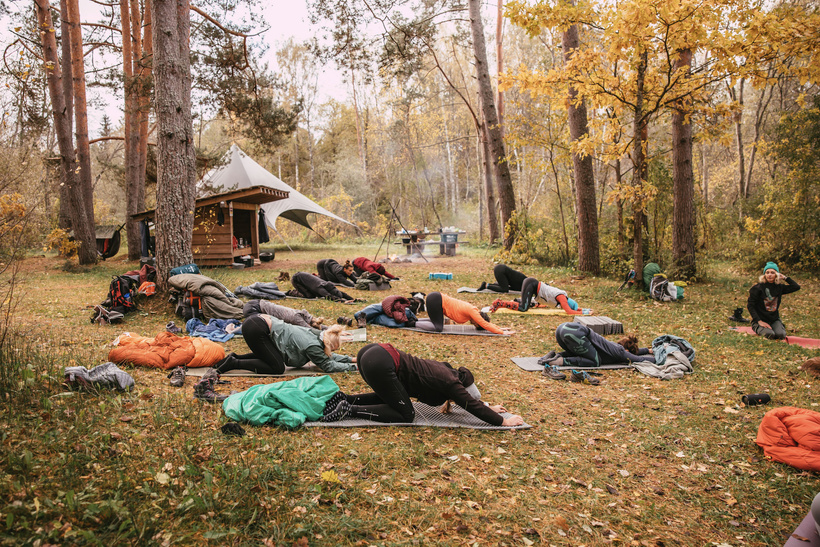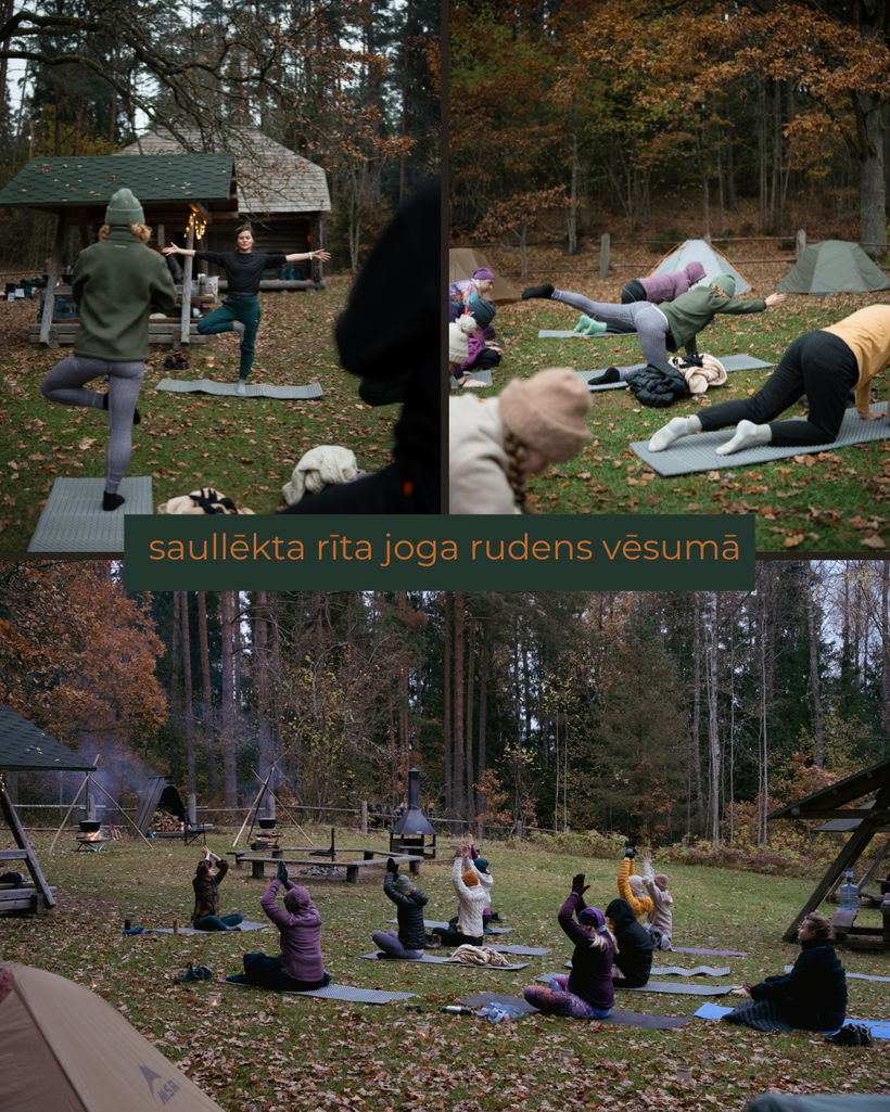 Rītu sākām ar aukstumpeldi, bet turpinājām meža jogu kopā ar Umu no Antena Yoga @antenayoga. Neizmērojami liels paldies Umai par iespēju atbraukt pie mums uz nometni un vadīt jogu vēsā oktobra rītā ārā. Viņa noteikti iesildīja un izkustināja. Atri vien uztuntulētās jakas tika mestas pie malas. Jogu noslēdzām ar meditāciju satuntulējušās guļammaisos un paslēpušās zem lielās telts no lietus lāsēm.