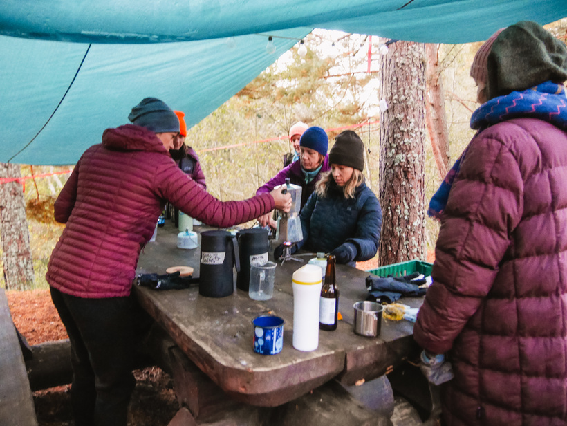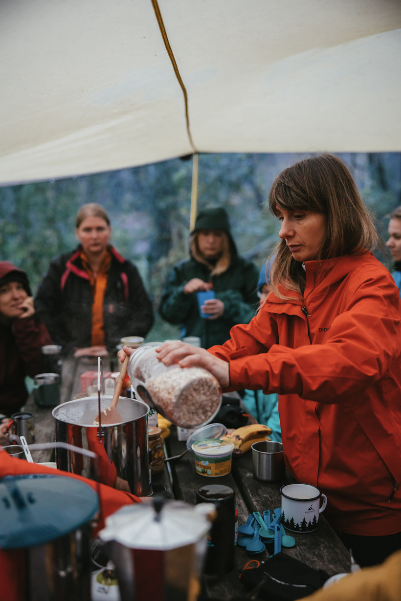 No rīta mūs sagaidīja rudenīgs, dzestrs gaiss. Pāris drosmīgās devās arī aukstumpeldēs, bet pārējās sildījās ar karstu kafiju no mokas kanniņām. Brokastīs – “Smalkais Muslis” ar dažādām piedevām. Kopš “Smalkais Muslis” piedalījās vienā no iepriekšējiem izaicinājumiem, mums izveidojusies lieliska sadarbība – un tagad viņu gardumi kļuvuši par Meža Meitu brokastu tradīciju.