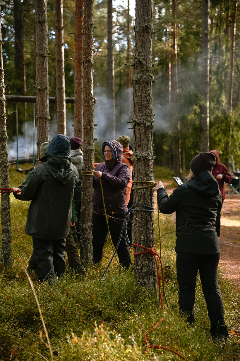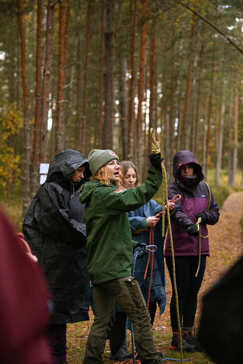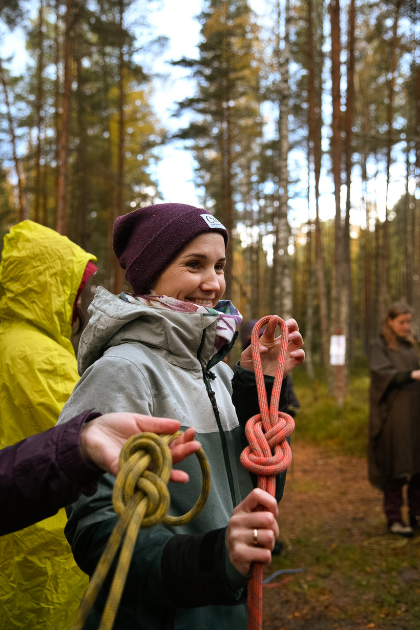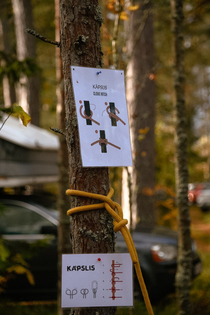 Pēc kopīgi pagatavotām brokastīm ķērāmies pie mezglu siešanas darbnīcas ar manu kolēģi un kāpēju Artu Celitāni (Lūzumpunkts). Apskatījām, mācījāmies dažus no noderīgākajiem mezgliem ejot un esot dabā. Prieks skatīties ar kādu interesi un vēlmi iemācīties visas meža meitas darbojās. Man ir ļoti savarīgi pasākumos iekļaut kādu mācīšanās procesu.