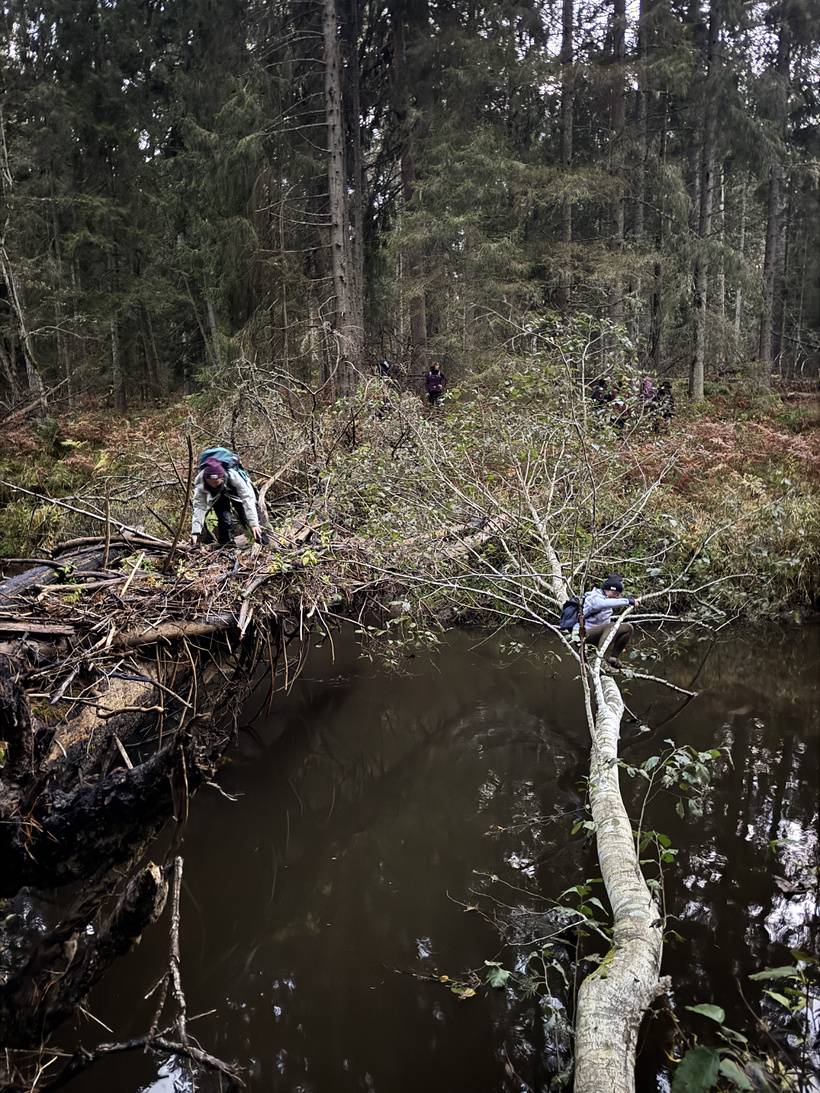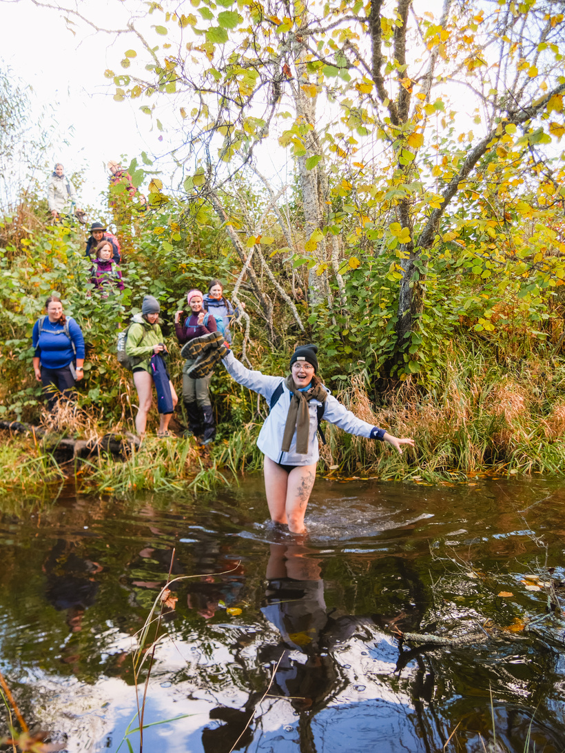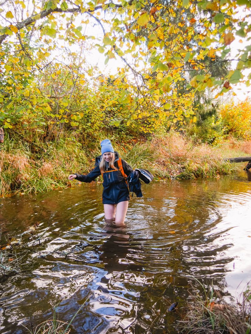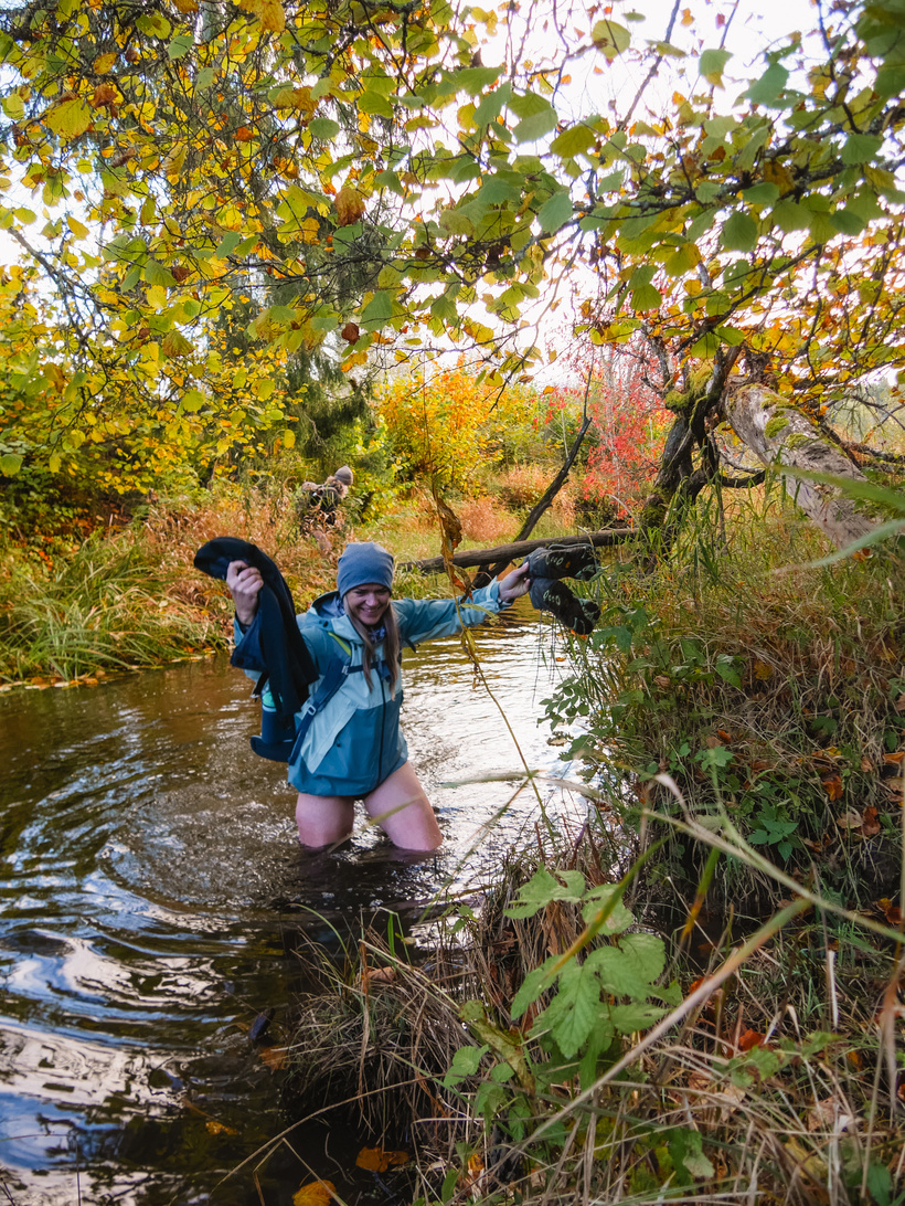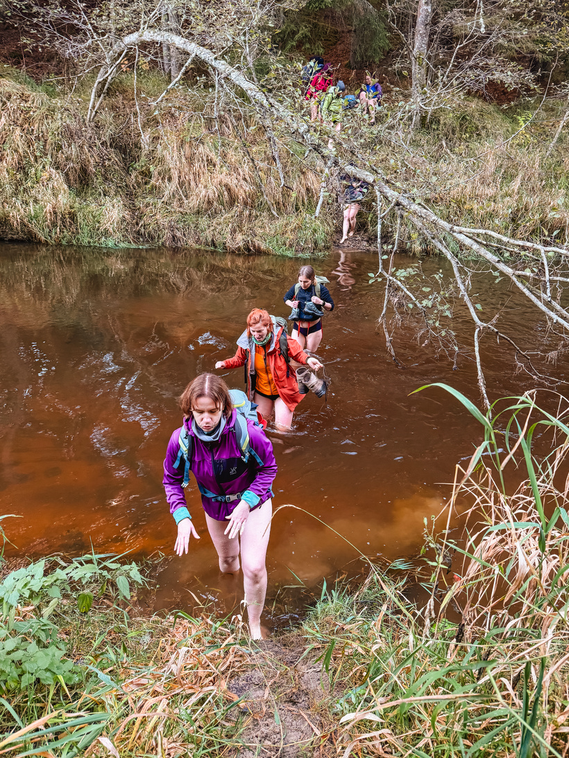 Pēc dažiem kilometriem gar jūru, bridām iekšā kāpās un devāmies jau tālāk dziļāk mežā. Ceļi veda gan pa skaistām meža takām, gan ceļiem, gan paparžu laukiem, gan burvīgām mazupītēm, kuras atklāj savu skaistumu rudens krāsās un birstošās lapās. Lielākās gaidas bija par pirmo upes šķērsošanu un katrs līkums sākumā gar mazo upi tika uztverts kā potenciālais “bikšu vilkšanas nost” brīdis. Pirms pasākuma čatiņā tika smiets, ka jāvelk savas pašas skaistākās apakšbikses, lai bildēs izskatītos labi un, ka upē būs apakšbikšu parāde. Vēlāk spriedām, ka uzvarēja tomēr klasika - melnā krāsa bija visizplatītākā. 😀