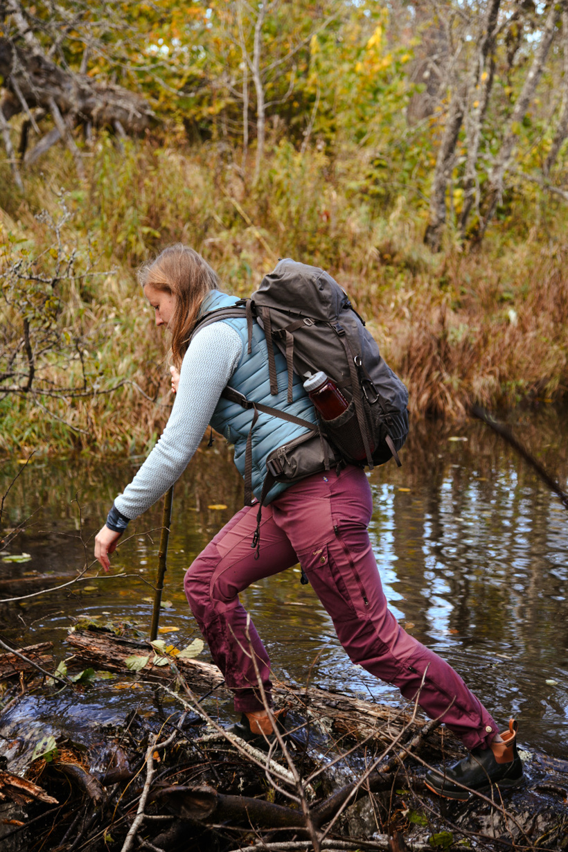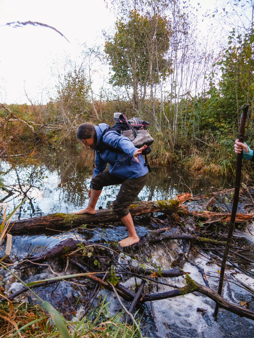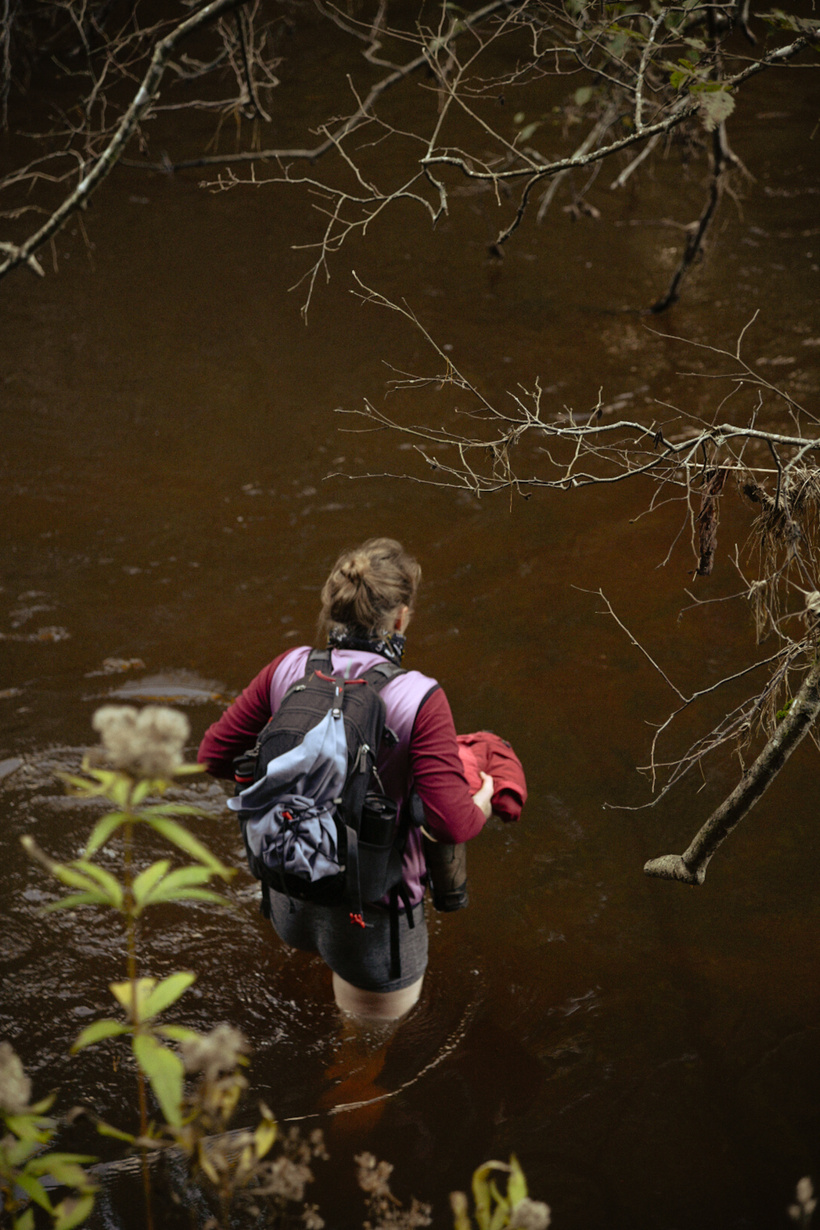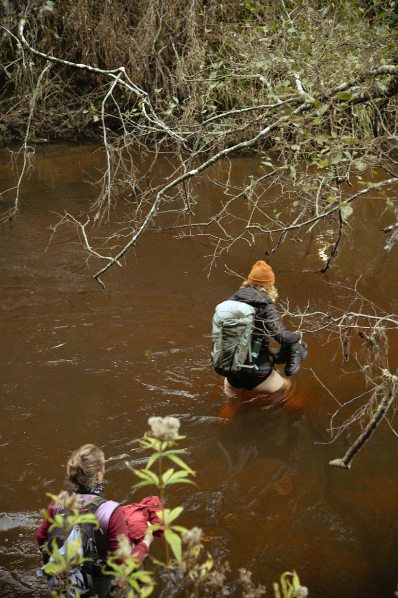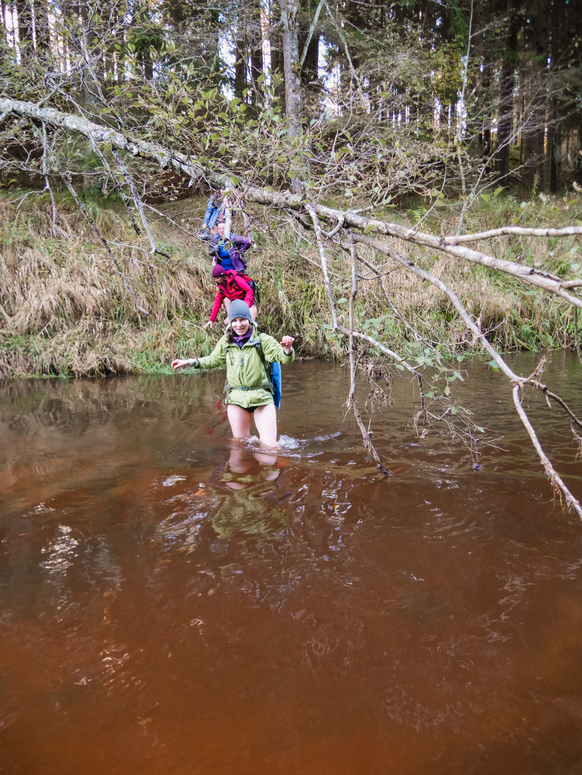 Pie nākamās upes šķērsošanas nonākam, izbrienot mazliet purvainākas brikšņu vietas — ir jau neliela krēsla, piezogas arī vēsums. Nolemjam meklēt vietu, kur pāri kādi koki. Kartē esmu atzīmējusi pāris opcijas. Nonākam pie dažiem pāri upei pārgāzušiem kokiem — krasti ir augsti, un koki tiešām kādu pusotru vai divus metrus virs ūdens. Te jābūt uzmanīgām.