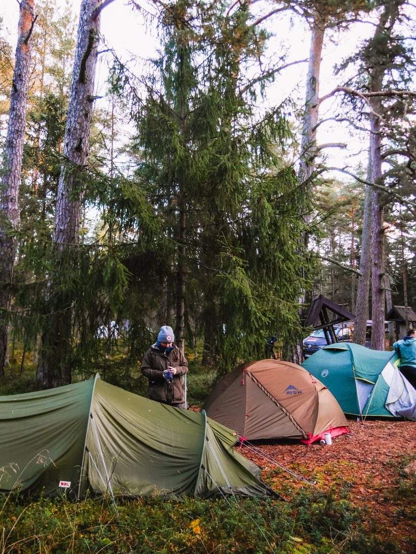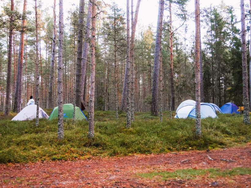 Pirmajā dienā noslēpojām 12 kilometrus un nometnes vietā ieradāmies ap 18.30. Nometnes vietu biju izvēlējusies ļoti šarmantu pie viena no ezeriem. Paldies tik foršiem vietējiem saimniekiem, kuru telefona numuru pirms pāris gadiem biju saglabājusi telefonā, pavisam nejauši pārgājienā nonākot kādā jaukā atpūtas vietā. Šoreiz tas ļoti atmaksājās, jo šī vieta patiesi iederējās maršrutā kā mūsu naktsmājas. Meža vidū, ezera malā, neliela nojume ar ugunskura vietu. Ziniet, kas vēl? Vēl ekskluzīvāk bija tas, ka varēja iekurt ezera malā esošo pirtiņu. Naktī vēstīja krietni lielākus mīnusus, tāpēc šķita, ka būs labi, ja būs silta vieta, kur aši noskaloties. Dikti nepirtojāmies un nesildījāmies, bet opcija bija gandrīz kā īstā retrītā.