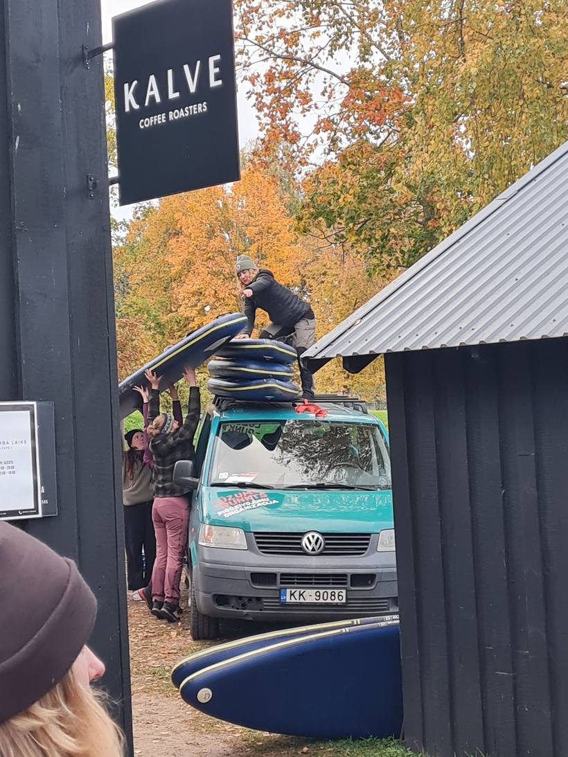 Ar to viss nebeidzas — dāmas palīdz sakrāmēt mums SUP dēļus uz abu busu jumtiem. Te nu gan vienmēr pietrūkst garāku augumu, kamēr mēs ar Artu, katra balansējot uz sava busa jumta, kraujam dēļus un sienam tos klāt.