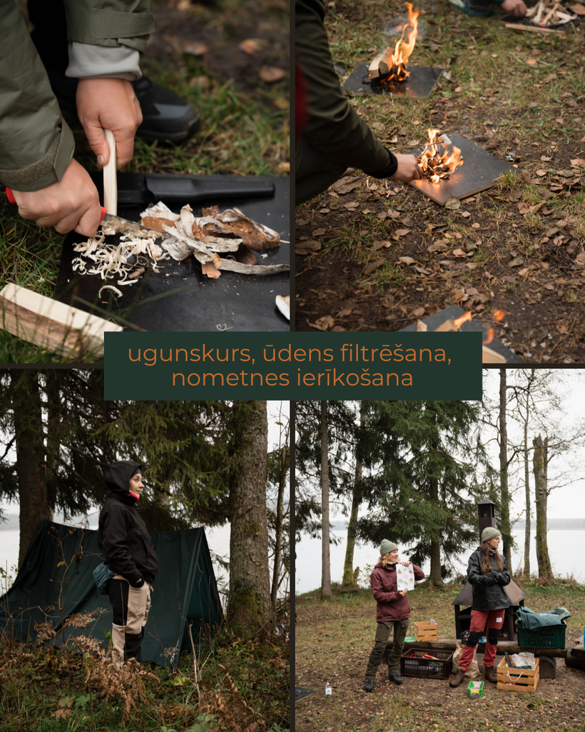Uguns, ūdens, nometne (āra dzīves pamatprasmes), ko vadīju es - Agnese un Maija Krastiņa. Mācījām kā iekurt ugunskuru dažādos veidos, kā filtrēt ūdeni, runājām par nometnes iekārtošanu un svarīgiem aspektiem, kas jāņem vērā. Iemēģinājām rokas guļvietas veidošanā no parastiem tentiem.